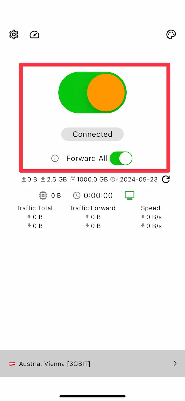 To enable VPN, click on the big orange switch, after which the VPN will be enabled.